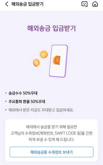 그래서 다시한번 앱에 '해외송금 입금받기' 부분을 들어가서 하단에 있는 입금받기를 눌러보았습니다.