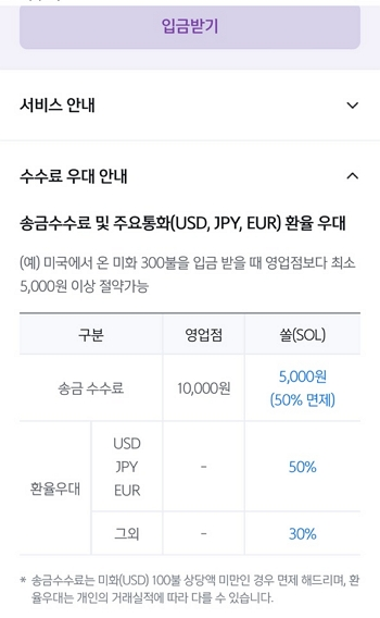 수수료 부담 사항을 자세히 보니, 외화를 송금(받을때) 수수료는 이렇게 쏠(sol) 어플 또는 인터넷뱅킹을 이용하여 직접 이런식으로 입금처리하는 경우는 수수료 50%감면이니 꼭 확인하고 앱으로 입금 진행하시길 바랍니다!!