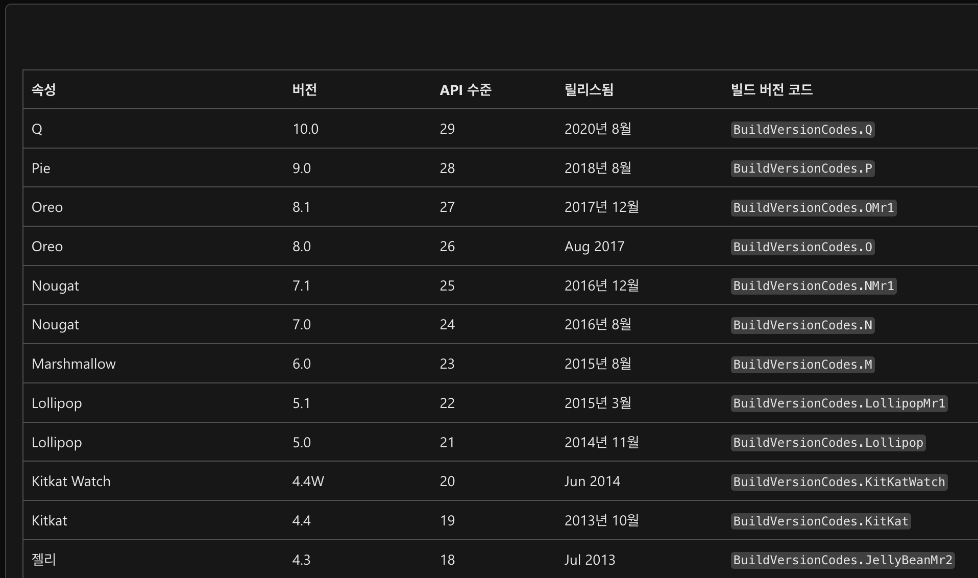 아래는 이전버전에 대한 정보(API29 이하) 릴리즈된 시기와 빌드버전코드 정보