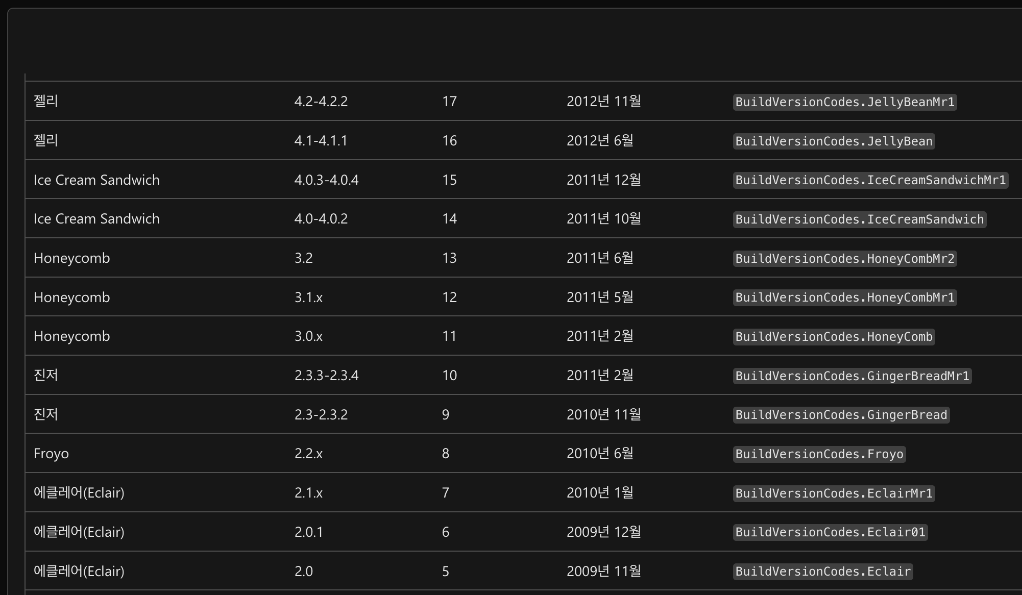 | 코드명 | 버전 | API수준/NDK 출시 |